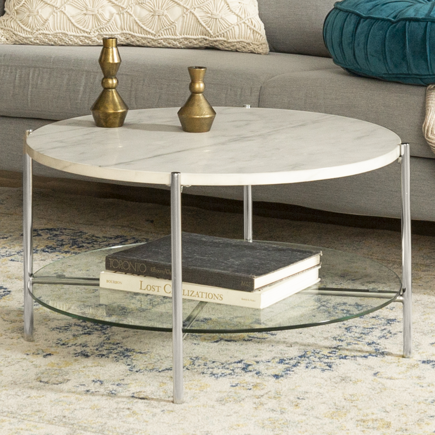 Round White Coffee Table In Faux Marble With Glass Shelf Foster Furniture123