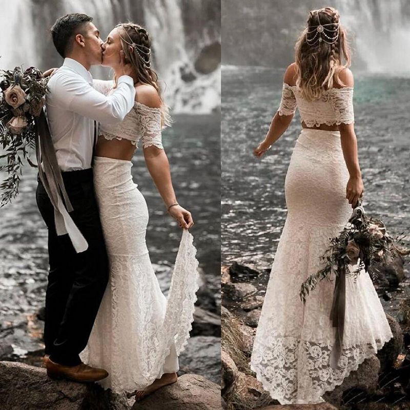 Two Piece Off The Shoulder Half Sleeves Beach Wedding Dress With Lace Two Piece Wedding Dress Cheap Bridal Dresses Aline Wedding Dress